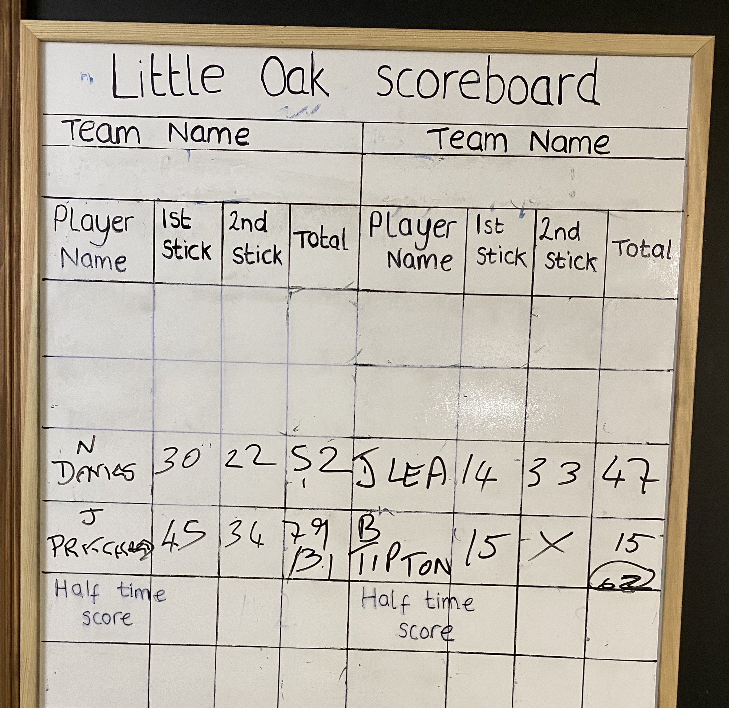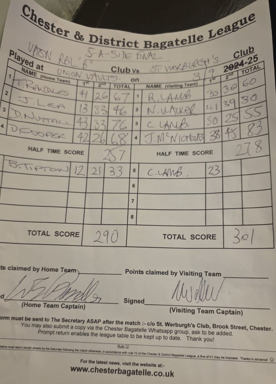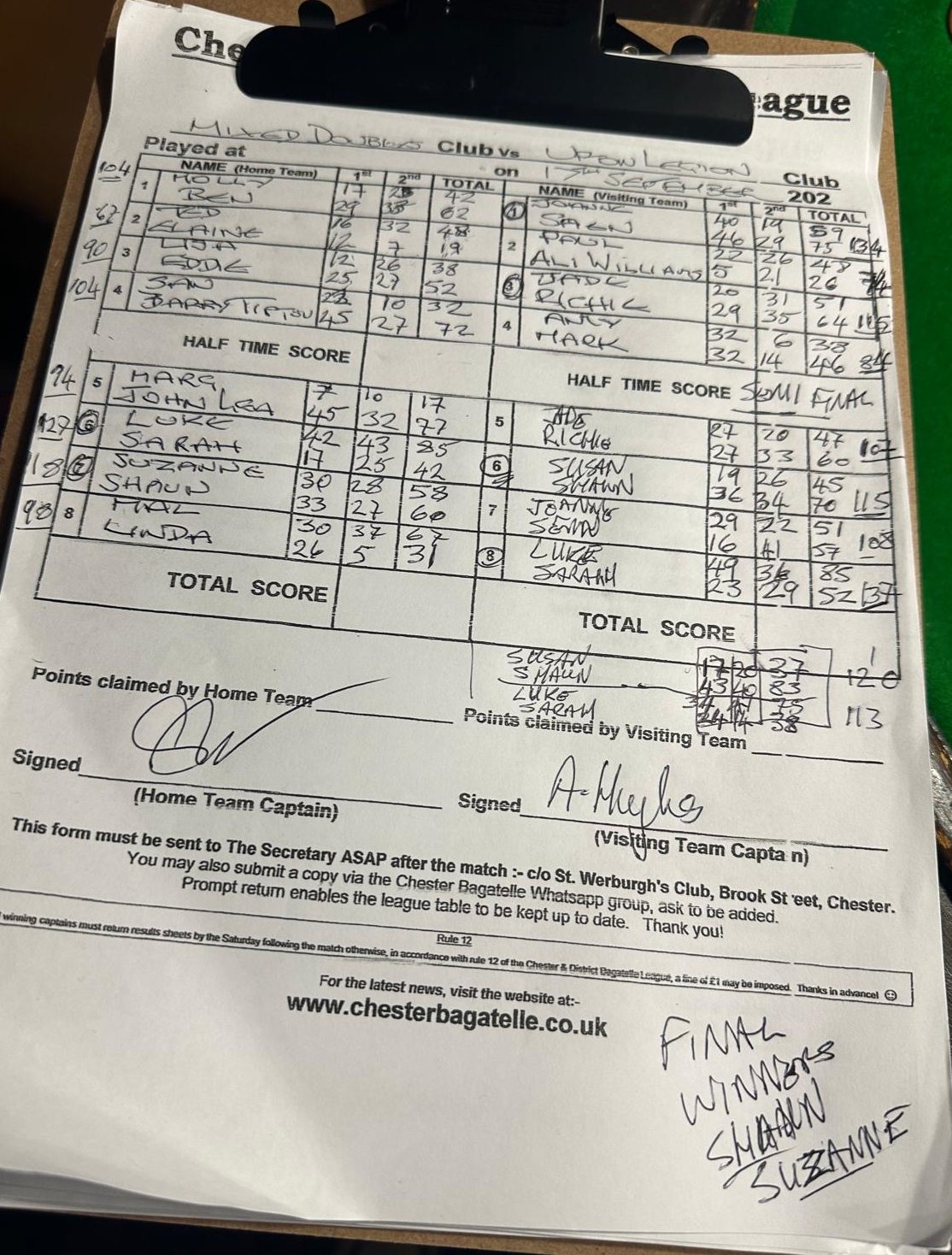 winners FT scores 418-588. Upton A had 7 players and Upton B had 8.